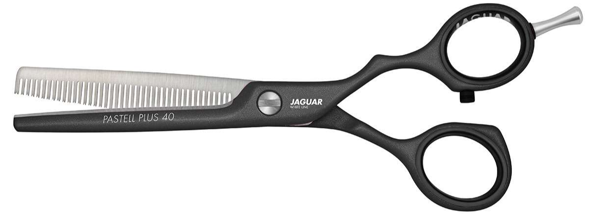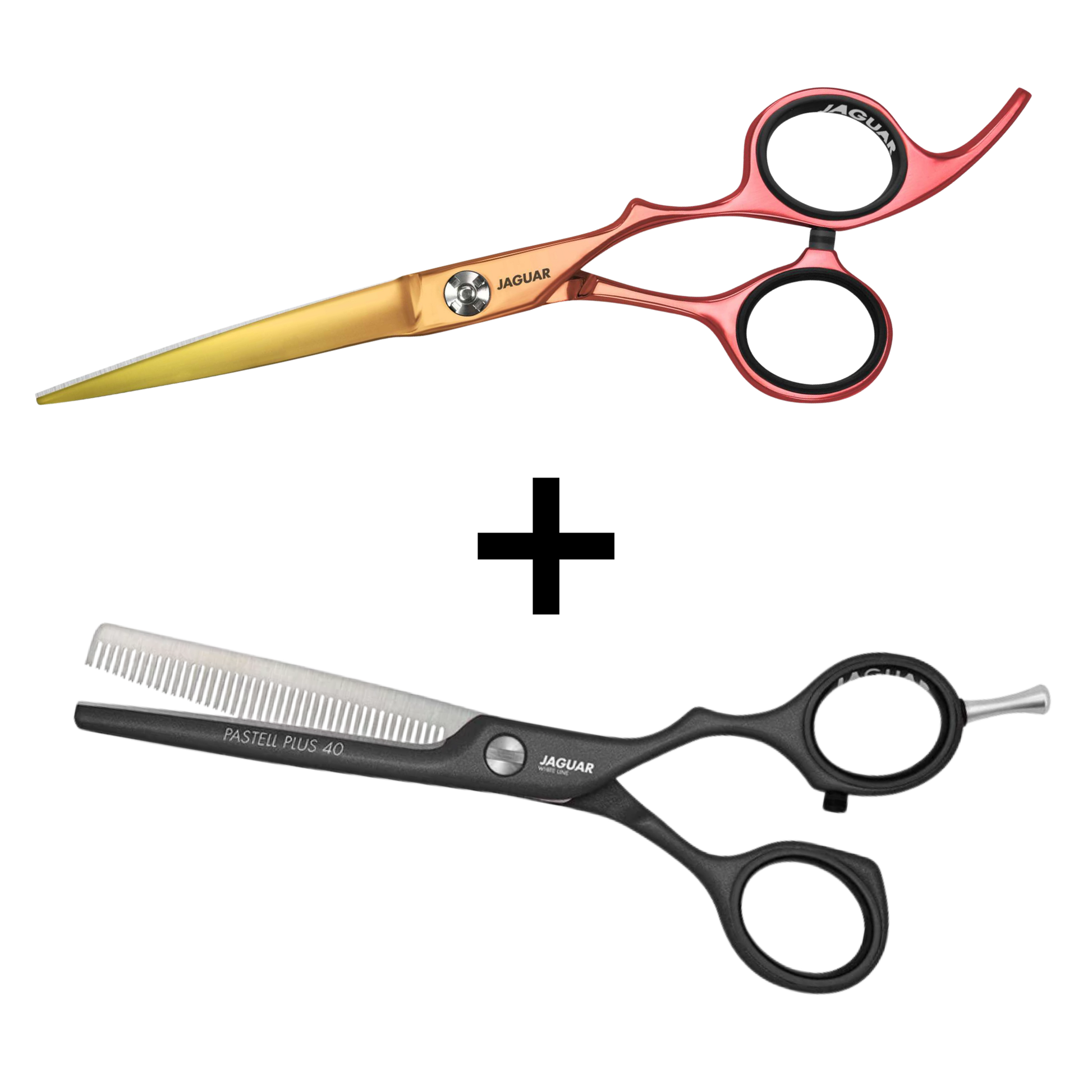 The scissors Jaguar Lyra feature a gradient design from red to gold, for a guaranteed wow effect. The sculpting scissors Jaguar Pastell Lava are black and match perfectly with the cutting scissors.
