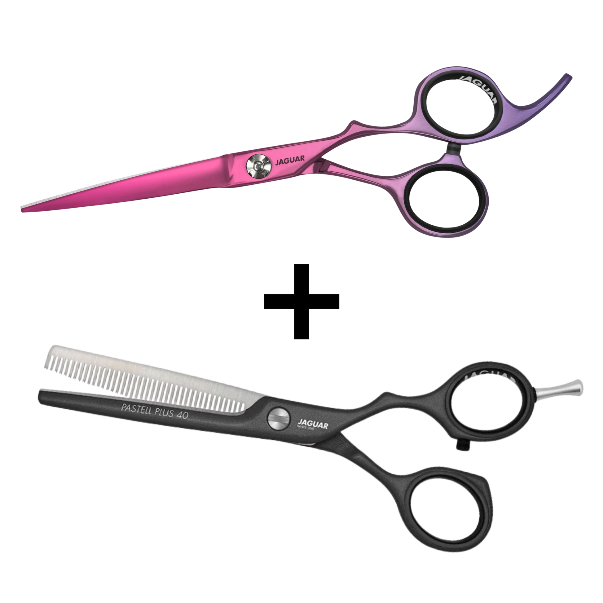 The scissors Jaguar Nya feature a gradient design from purple to pink, ensuring a wow effect. The sculpting scissors Jaguar Pastell Lava are black and perfectly match the cutting scissors.